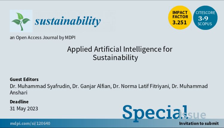 My colleagues and I are guest editing a special issue “Applied Artificial Intelligence for Sustainability”, which will be published continuously by Sustainability (SSCI SCIE JCR Q2, Scopus SJR Q1).